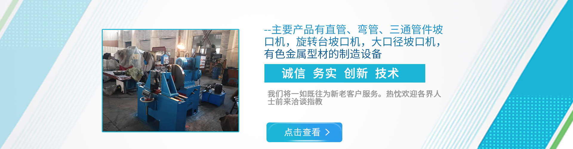 公司現(xiàn)下轄兩個(gè)分廠,一分廠主營(yíng)電動(dòng)管道坡口機(jī)和焊接設(shè)備,適用于造船、電力工程安裝、石油、化工、鍋爐廠、冶金以及鋼鐵行業(yè); 二分廠主營(yíng)雙頭坡口機(jī),600mm直管坡口機(jī)和金屬型材擠壓生產(chǎn)線,適用于銅、鋁、鎂、鉛、鋅等有色金屬及其合金的加工。